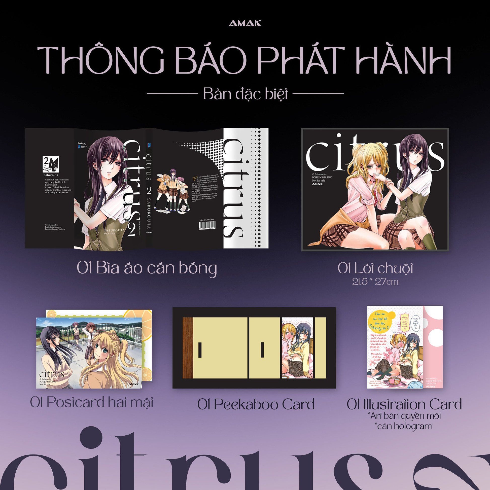 - Bản đặc biệt: 01 postcard hai mặt 10x15cm, 01 Peekaboo Card, 01 Hologram Illustration Card (sử dụng art bản quyền mới, vốn là quà tặng ĐỘC QUYỀN khi mua Citrus 2 tại chuỗi cửa hàng Toranoana ở Nhật), 01 lót chuột kích cỡ 21,5x27cm.